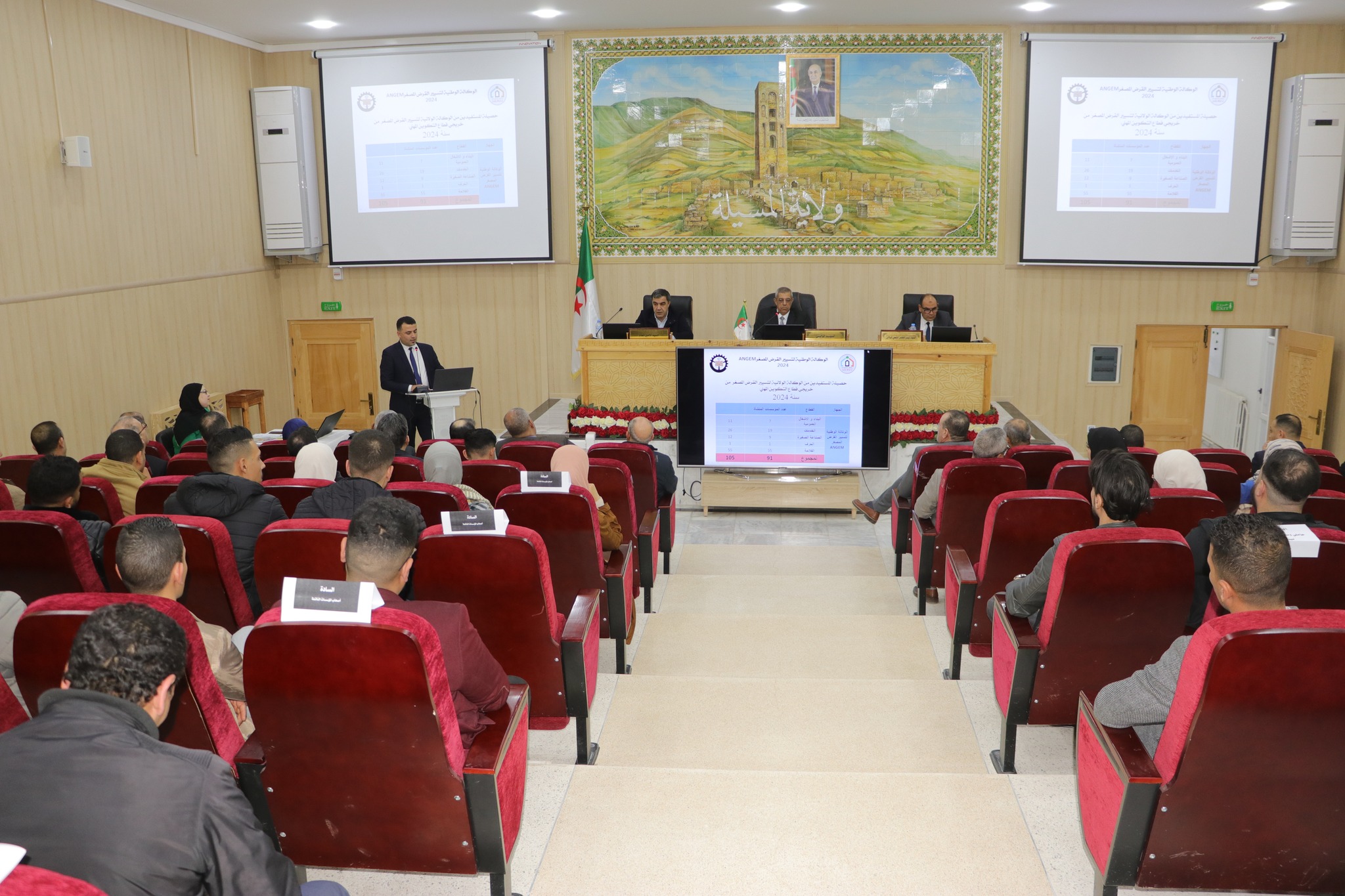 ليتم الاستماع بعدها إلى عروض مختلفة من طرف السادة: مدير التشغيل، مدير جامعة محمـد بوضياف بالمسيلة حول مرافقة الجامعة لحاملي الأفكار والمشاريع الابتكارية، مدير التكوين والتعليم المهنيين حول مرافقة القطاع لفئة حاملي الأفكار والمشاريع الابتكارية، مدير الوكالة الولائية للتنظيم والتسيير العقاري الحضري حول مناطق النشاطات المنشأة، مدير التعمير والهندسة المعمارية والبناء حول وضعية مناطق النشاطات المصغرة، مديرة حاضنة الأعمال بالجامعة، مدير مركز تطوير المقاولاتية بالجامعة، مدير الوكالة الولائية لدعم وتنمية المقاولاتية NESDA حول آليات تمويل مشاريع المؤسسات الناشئة، حيث تمحورت التدخلات حول آليات المرافقة المعتمدة من طرف كل قطاع.