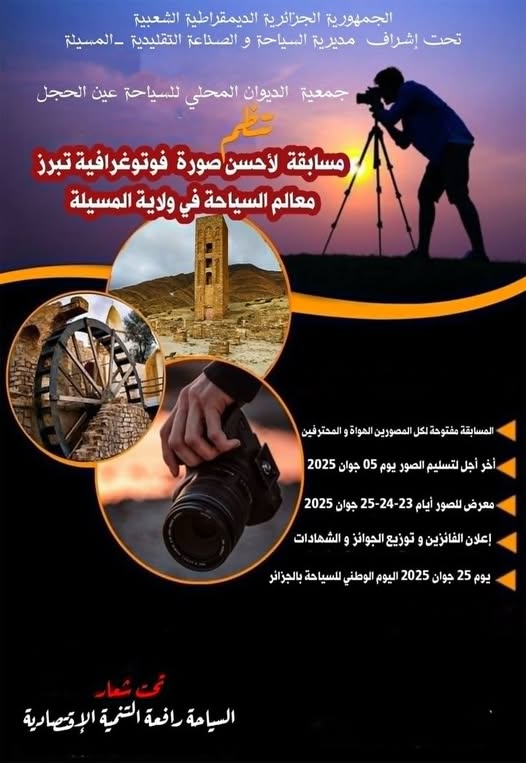 تحت إشراف مديرية السياحة والصناعة التقليدية لولاية المسيلة تنظم جمعية الديوان المحلي للسياحة عين الحجل : مسابقة أحسن صورة فوتوغرافية تبرز معالم السياحة في ولاية المسيلة، تحت شعار”السياحة رافعة التنمية الاقتصادية”
