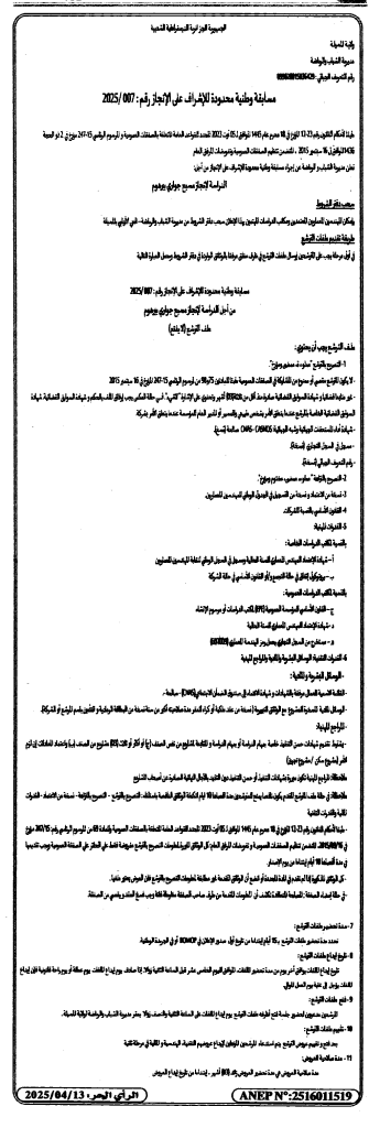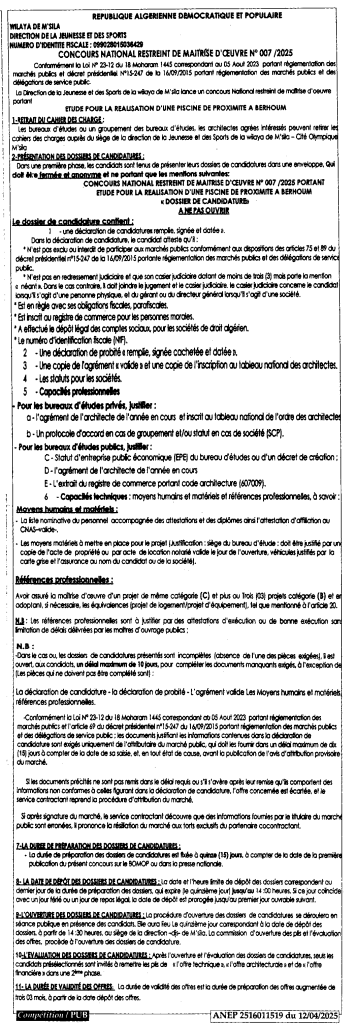 مسابقة وطنية محدودة للإشراف على إنجاز مسبح جواري برهوم رقم 2025/007 مديرية الشباب والرياضة لولاية المسيلة