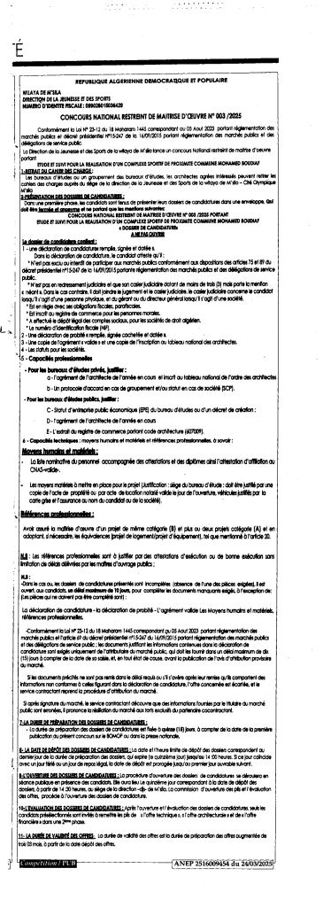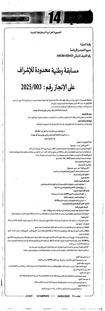 مسابقة وطنية محدودة للإشراف على الإنجاز 2025/03 مديرية الشباب والرياضة لولاية المسيلة