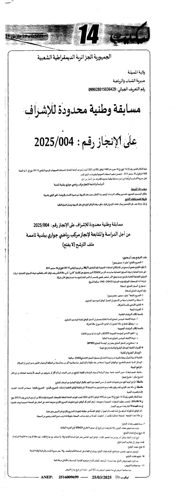 مسابقة وطنية محدودة للإشراف على الانجاز 2025/04 مديرية الشباب والرياضة لولاية المسيلة