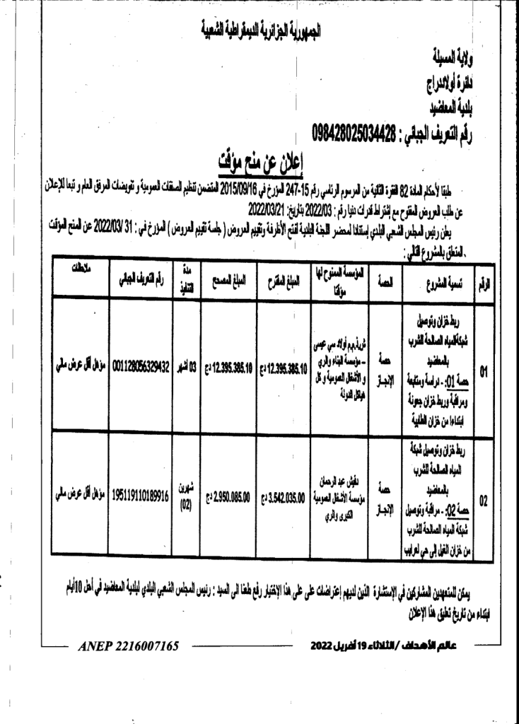 منح مؤقت لبلدية المعاضيد: لمشروع ربط خزان وتوصيل شبكة المياه الصالحة للشرب21 أبريل، 20220 12 شاركها فيسبوك X مشاركة عبر البريد طباعة