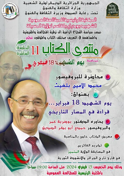 المسيلة/ المكتبة الرئيسية للمطالعة العمومية تدعوكم لحضورك فعاليات منتدى الكتاب الطبعة الحادية عشر، وبمناسبة اليوم الوطني للشهيد 18 فيفري 2024 مع المؤرخ البروفيسور “محمد الأمين بلغيث” وذلك يوم الخميس 15 فيفري 2025 بمقر المكتبة الرئيسية، يتخلل النشاط تكريم الفائزين بالمسابقة الولائية المتميز في قارئ تاريخ الجزائر، المتميز في الأنشودة الثورية