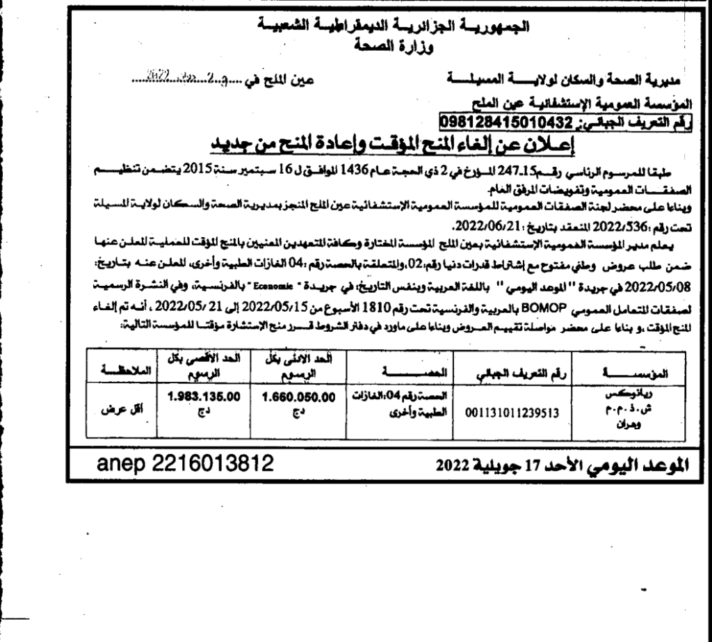 إعلان عن إلغاء المنح المؤقت وإعادة المنح من جديد المؤسسة العمومية الاستشفائية عين الملح
