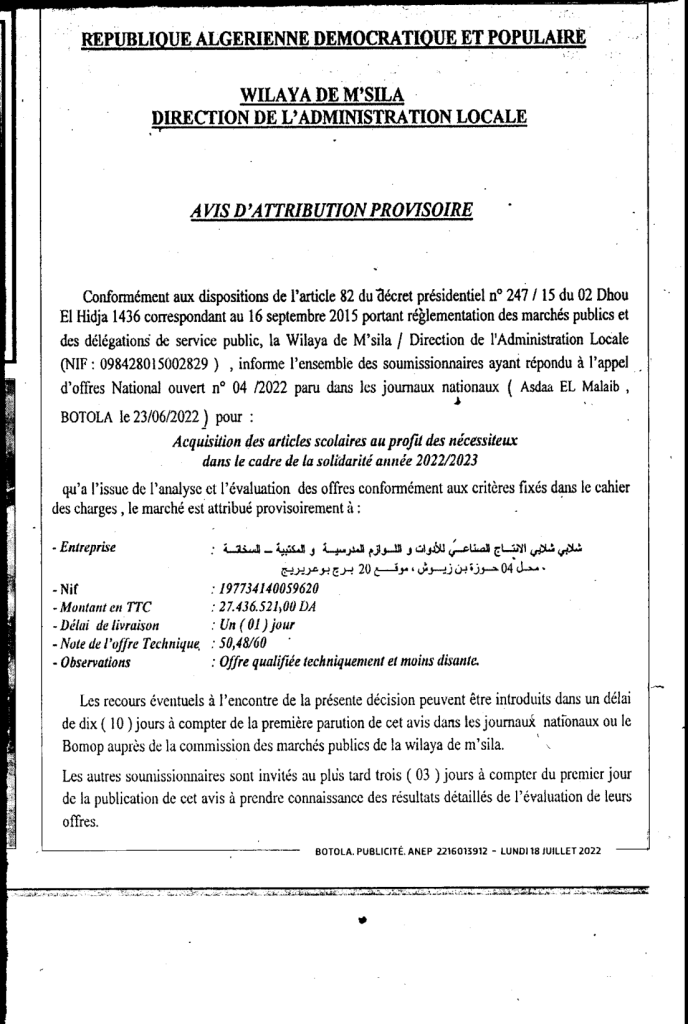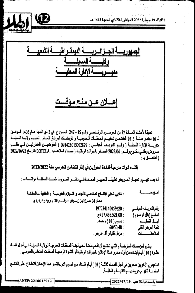إعلان عن منح مؤقت متعلق بـ إقتناء أدوات مدرسية لفائدة المعوزين في إطار التضامن المدرسي سنة 2023/2022 مديرية الادارة المحلية