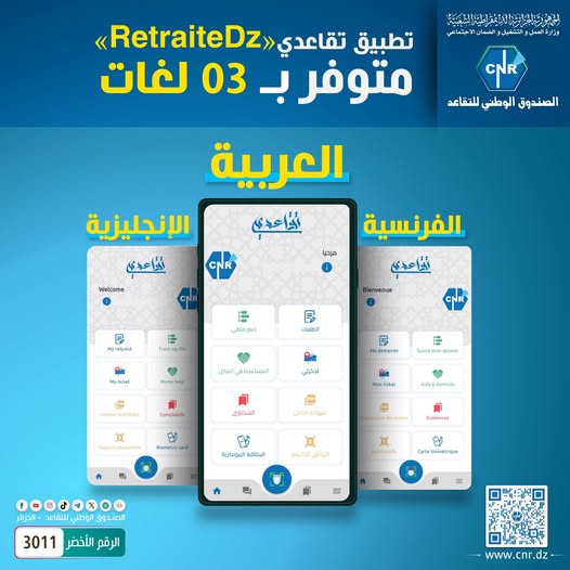 منصة الهاتف المحمول “تقاعدي RetraiteDz” تقدم لكم باقة متنوعة من الخدمات عن بُعد، بكل سهولة ويسر، بثلاثة لغات وهي: العربية، الإنجليزية، الفرنسية.