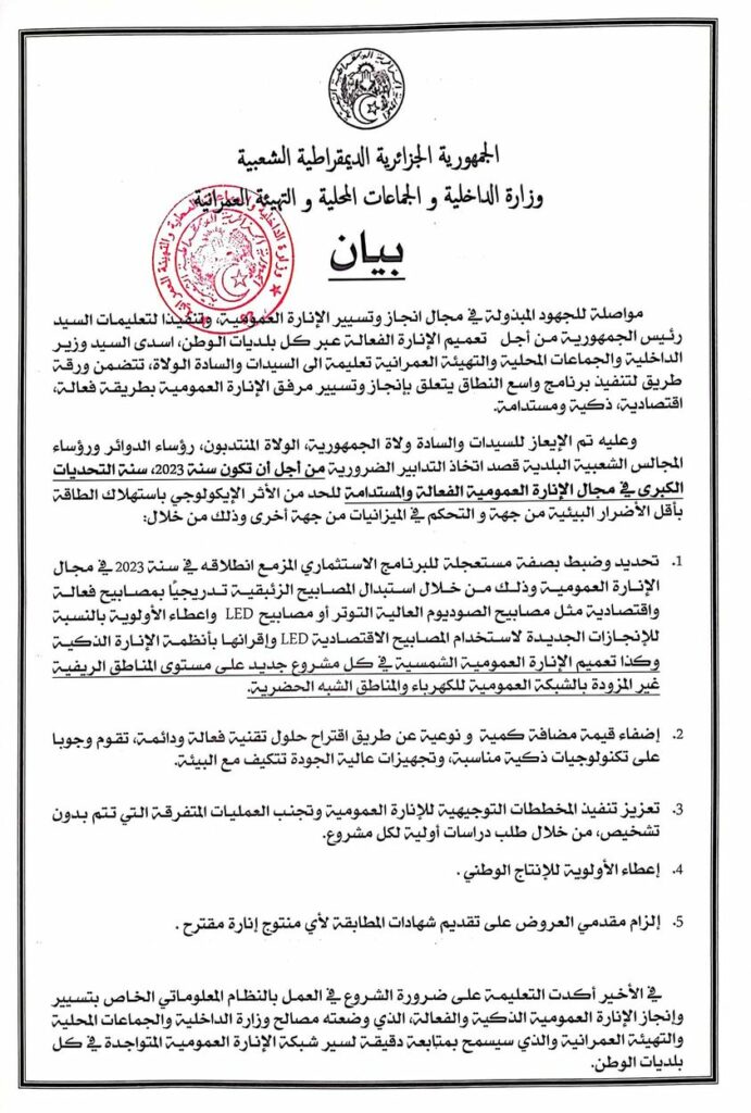 هــام/ تعليمة بخصوص الإنارة العمومية الفعالة المستدامة