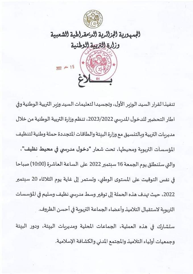 بلاغ هـــام/ وزارة التربية الوطنية