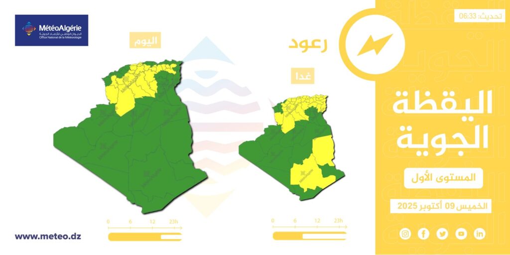 تنبيه من المستوى الأول باللون الأصفر، اليوم الخميس 33 أكتوبر 2025