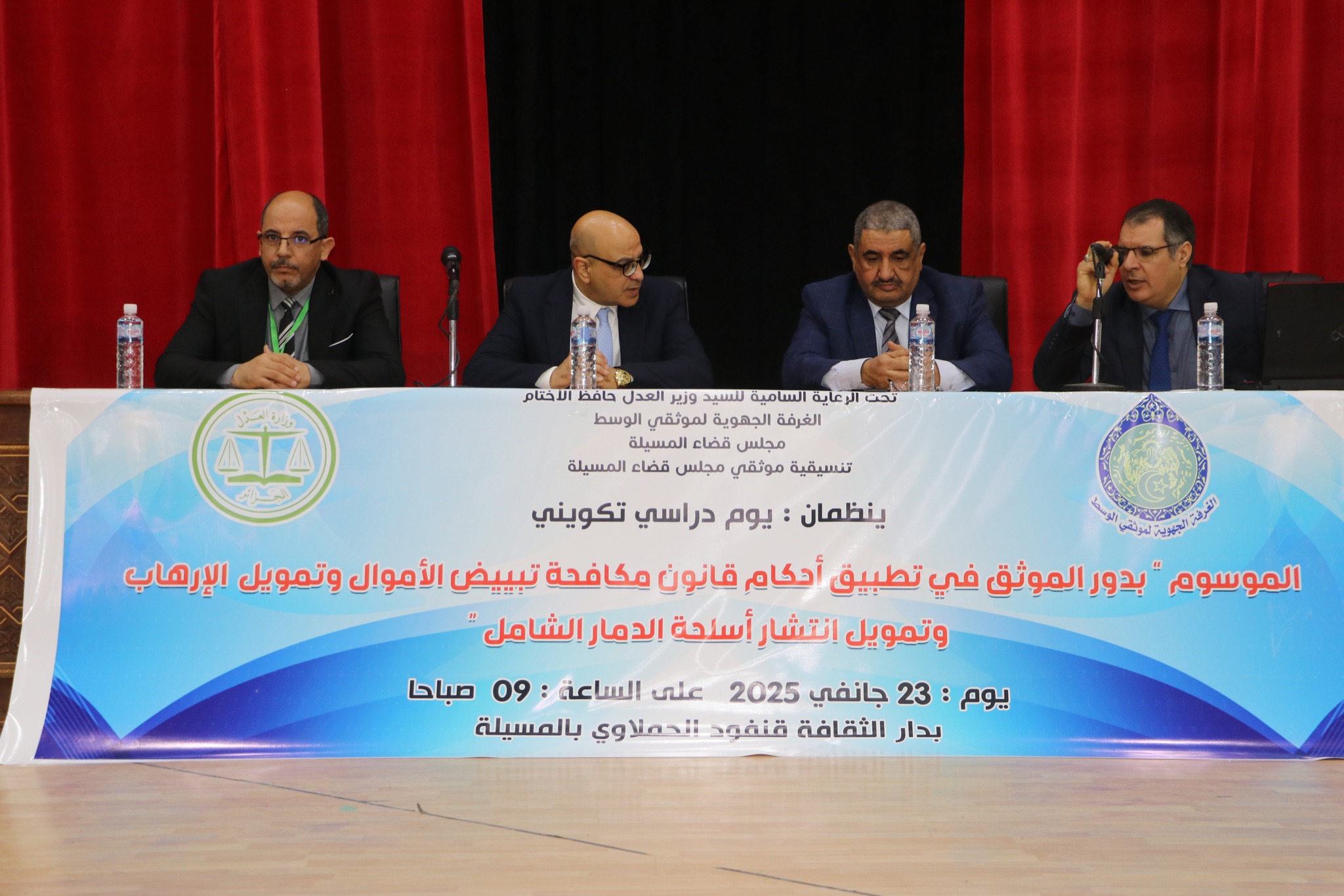 المسيلة/ حضر اليوم الخميس 23 جانفي 2025، السيد نجم الدين طيار والي الولاية، فعاليات أشغال اليوم الدراسي الموسوم بعنوان : “دور الموثق في تطبيق أحكام قانون مكافحة تبييض الأموال”، تمويل الأرهاب وتمويل إنتشار أسلحة الدمار الشامل، من تنظيم مجلس قضاء المسيلة، بقاعة المحاضرات دار الثقافة الشهيد قنفود الحملاوي بالمسيلة، بحضور كل من السادة: رئيس المجلس الشعبي الـولائي، أعضــاء اللجنــة الولائيـــة للأمن، مدير الشؤون الجزائية وإجراءات العفو بوزارة العدل، المدير الفرعي للأعوان القضائيين وختم الدولة بوزارة العدل، رئيس مجلس قضــاء المسيلـة، النائب العام لدى مجلس قضاء المسيلة، رئيس مجلس قضــاء البويرة، النائب العام لدى مجلس قضاء البويرة، رئيس المحكمــة الإداريــة، محافظ الدولة لدى المحكمة الإدارية، القضــاة، رئيس الغرفة الوطنية للموثقين، منسق الغرفة الجهوية لموثقي الوسط، رئيس منظمة المحامين لناحية البويرة، نقيب المحـامين بالمسيلة، رئيسة مصلحة العلاقات مع المنظمات الإقليمية والدولية بخلية معالجة الإستعلام المالي، ممثل الوسطاء القضائيين وممثل المحضرين القضائيين وممثل المترجمين، المـوثقـون، المحامـون، الخبـراء، المحضـرون، المندوب المحلي لوسيط الجمهورية، الأمين العام للولاية، رئيس دائرة المسيلة رئيس المجلس الشعبي لبلدية المسيلة، مدراء الهيئة التنفيذية، ممثلي البنوك وشركات التأمين، مأمور السجل التجاري، ممثل بريد الجزائر بالمسيلة، والأسـرة الإعلامية.