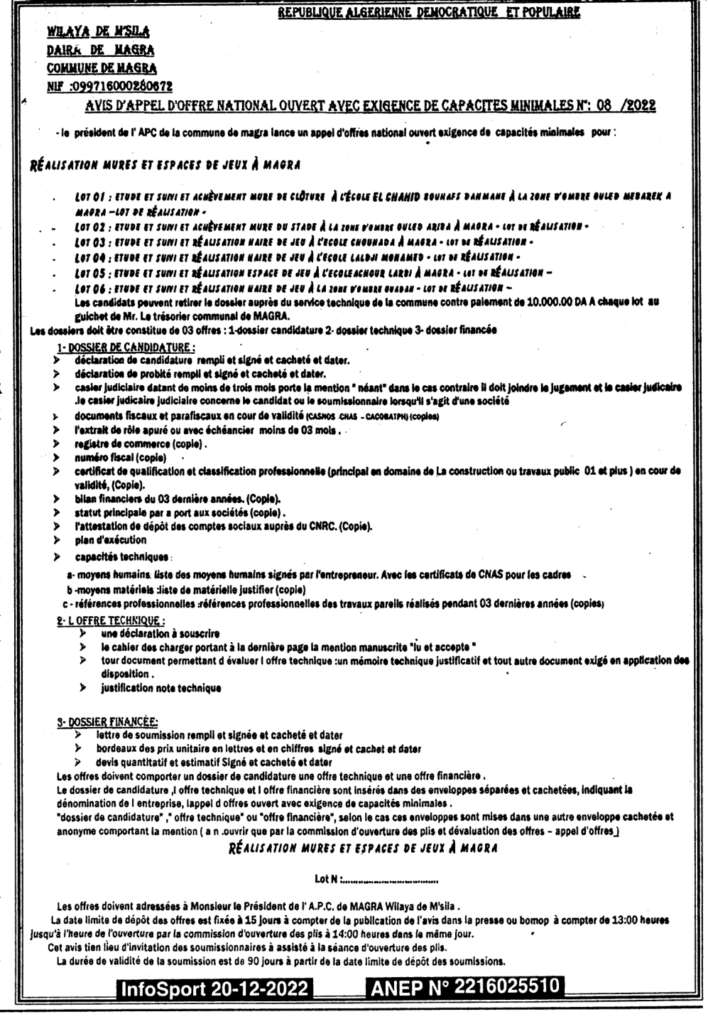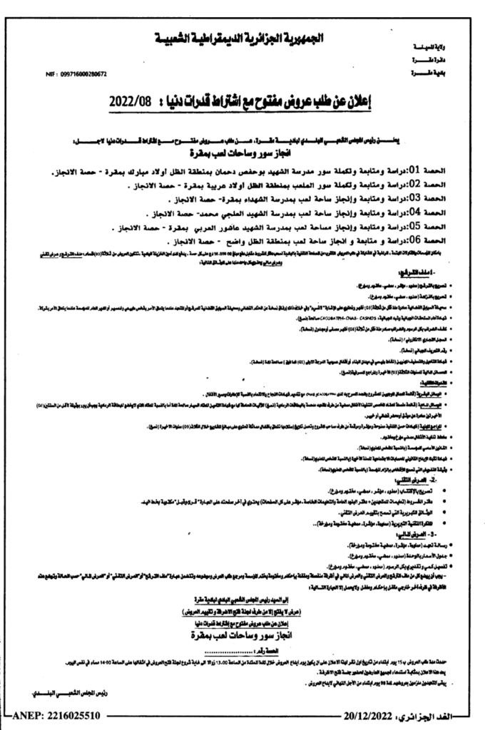 طلب عروض مفتوح مع اشتراط قدرات دنيا لأجل: إنجاز سور وساحات لعب بمقرة20 ديسمبر، 20220 16 شاركها فيسبوك X مشاركة عبر البريد طباعة