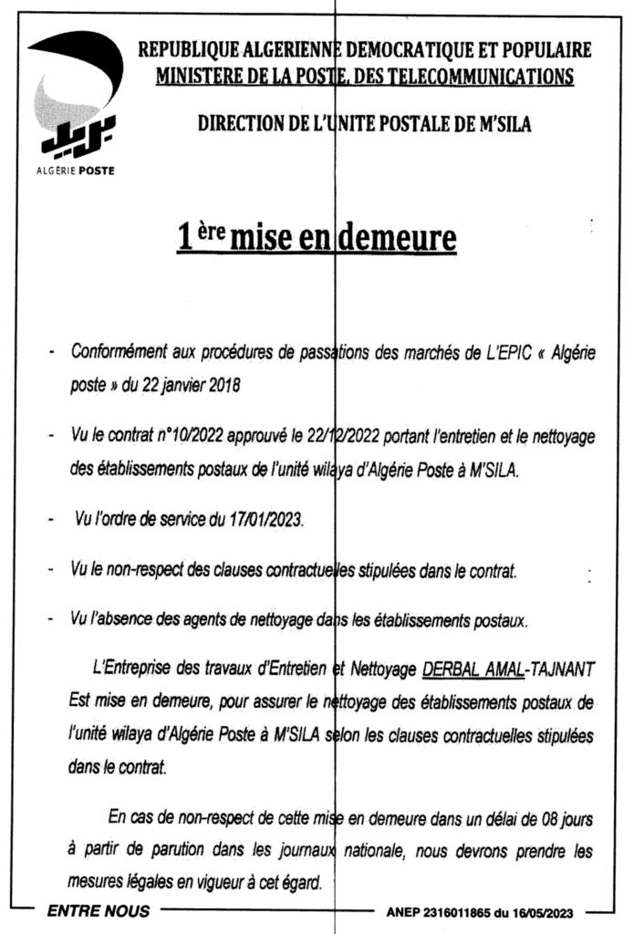 1ère Mise en Demeure/ Direction de l’unite postale de M’sila