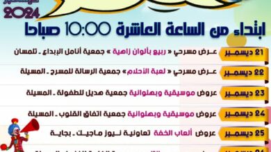 تحت إشراف مديرية الثقافة والفنون لولاية المسيلة، وبمناسبة عطلة الشتاء، تنظم دار الثقافة الشهيد قنفود الحملاوي لولاية المسيلة، عروض مسرحية…