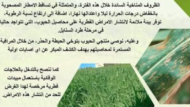 الأمراض الفطرية شعبة الحبوب: نتيجة الرطوبة المرتفعة وتساقط الأمطار، يُسجل خطر انتشار الأمراض الفطرية على محاصيل الحبوب في مرحلة حساسة…