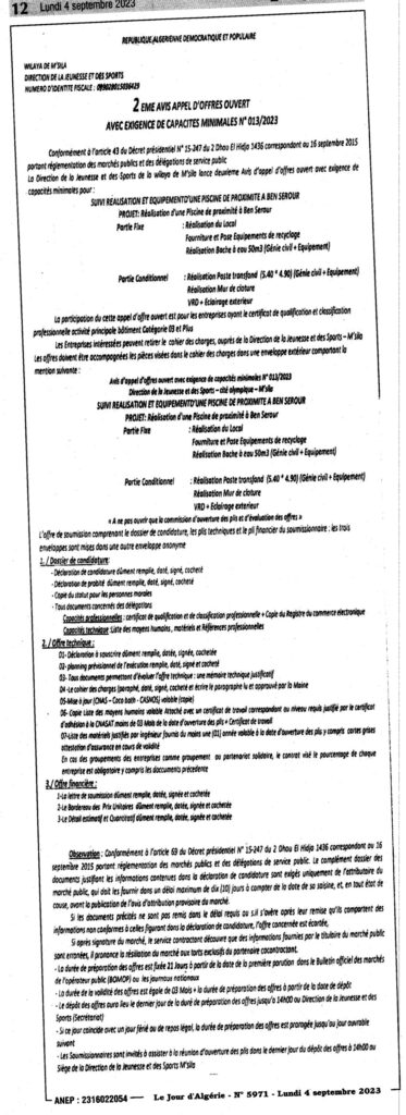 2eme Avis appel d’offres ouvert N°13/2023 Direction de la jeunesse et des sports