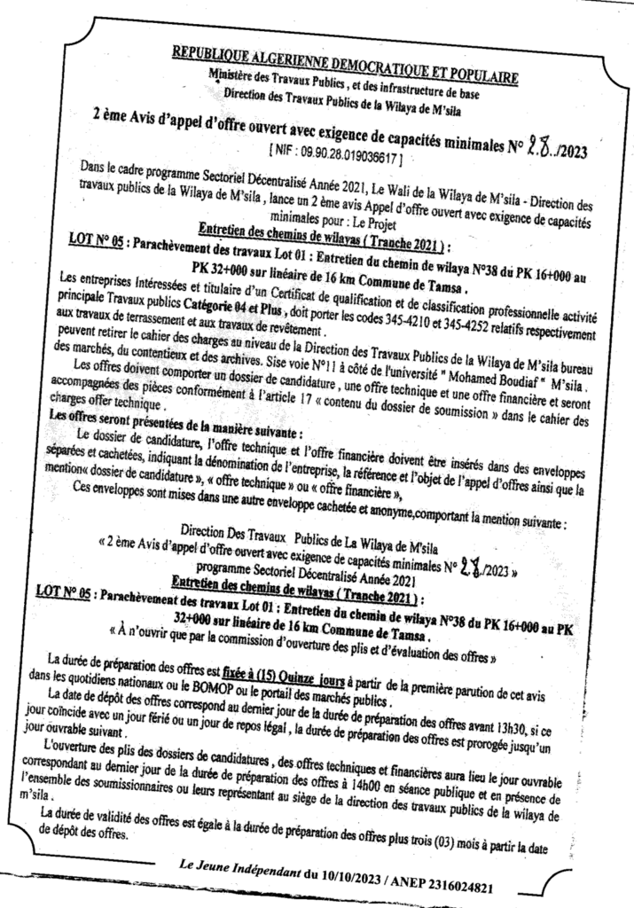 2éme Avis d’appel d’offre ouvert N°28/2023 Direction des travaux publics de la wilaya de M’sila