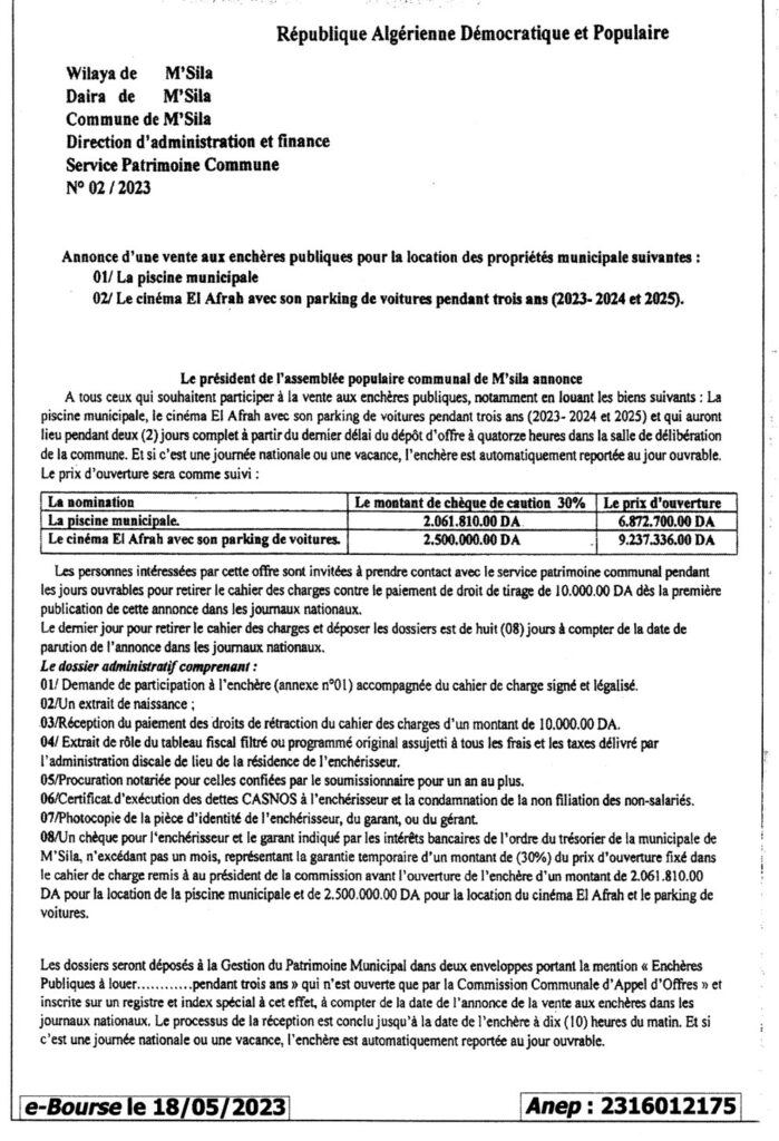 Annonce d’une vente aux enchères publiques pour la location des propriétés municipale Commune de M’sila