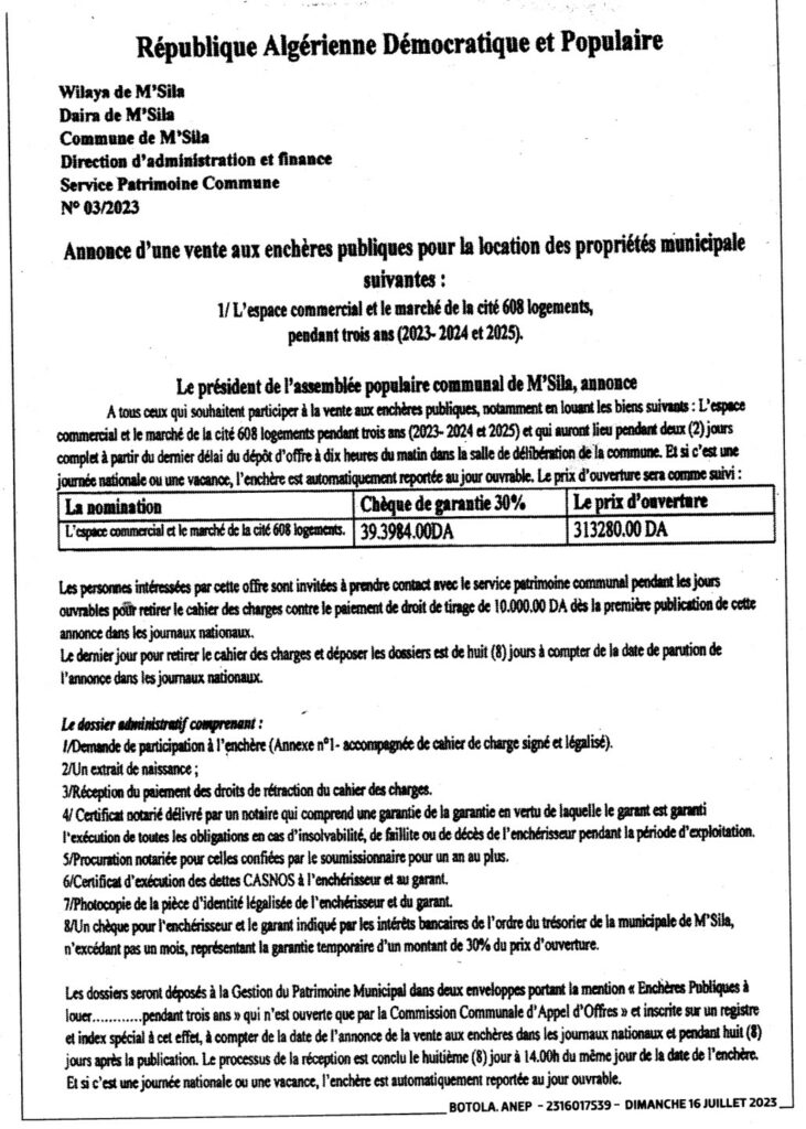 Annonce d’une vente aux enchères publiques pour la location des propriétés municipale