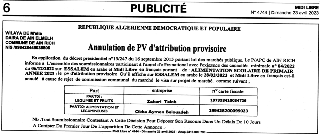 Annulation de PV d’attribution provisoire/ Commune de Ain-Rich