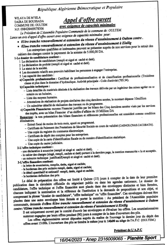 Appel d’Offre Ouvert Commune de Oultem