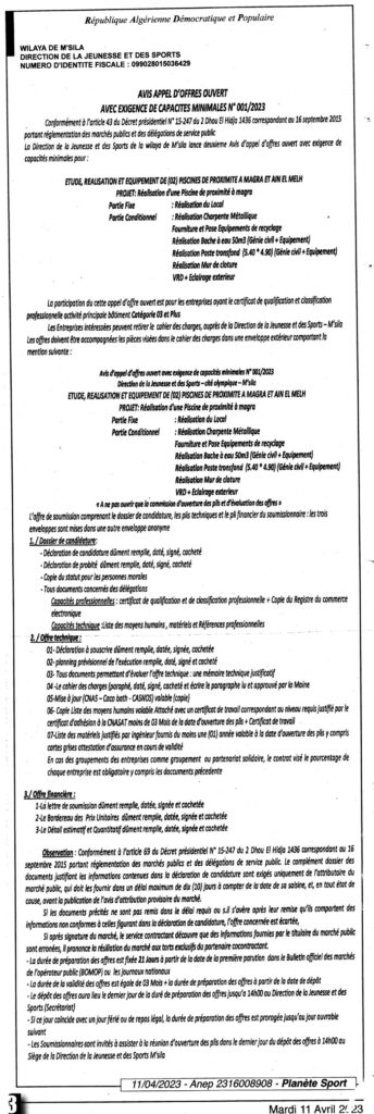 Avis Appels Ouvert 01/2023 Direction de la Jeunesse et des Sports Wilaya de M’sila