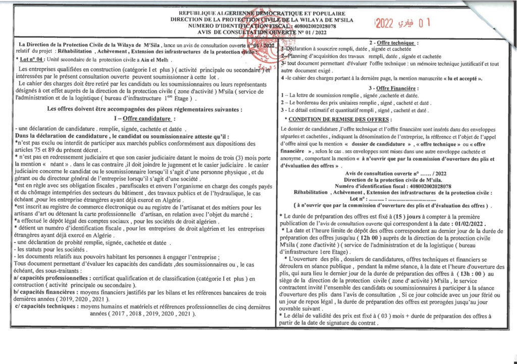Avis d Consultation Ouverte 01/2022: Réahabilitation, Achévement et Extension des Infrastructures de la Protection Civile