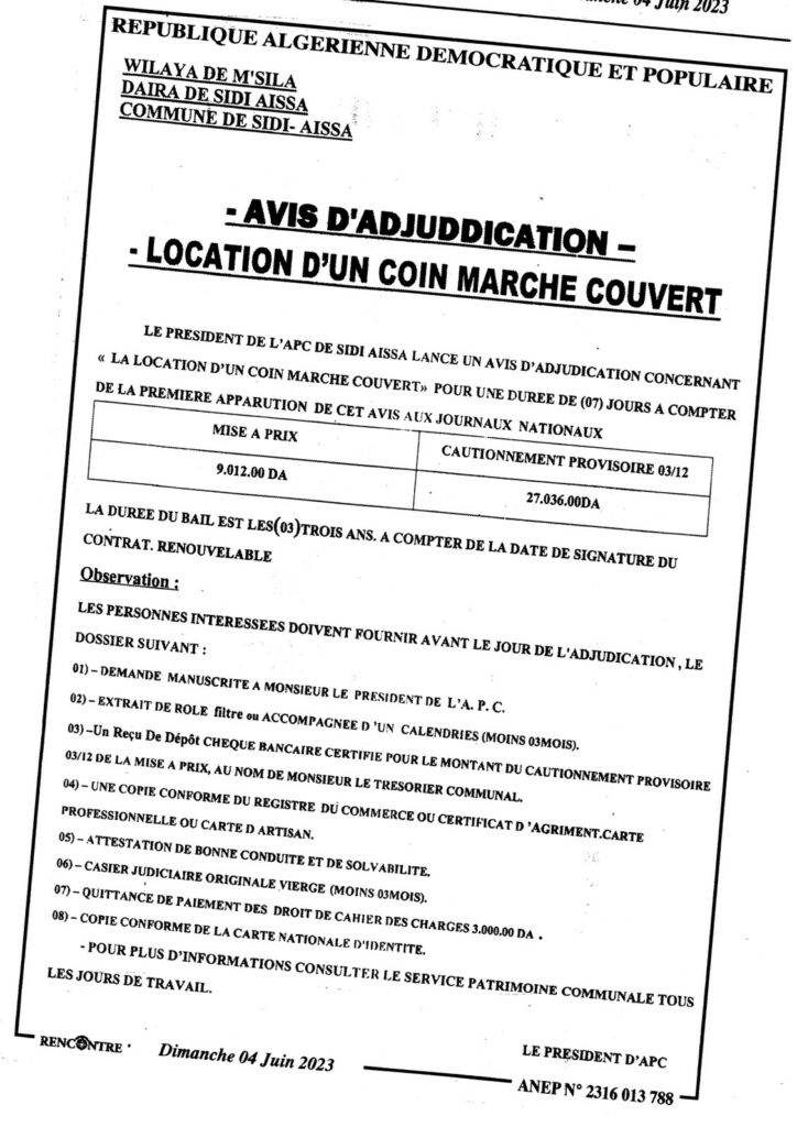 Avis d’Adjudication- location d’un coin marche couvert Commune de Sidi Aissa