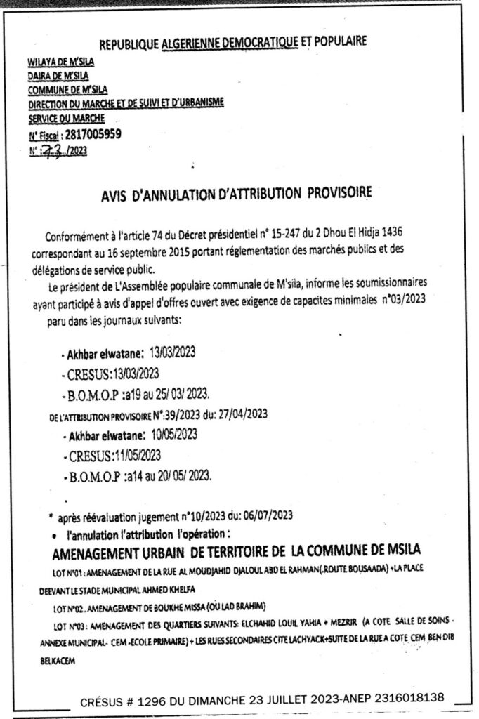 Avis d’annulation d’attribution provisoire/ Commune de M’sila