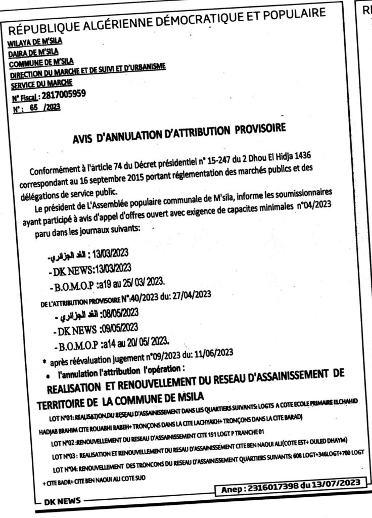 Avis d’annulation d’attribution provisoire N°65/2023 Commune de M’sila