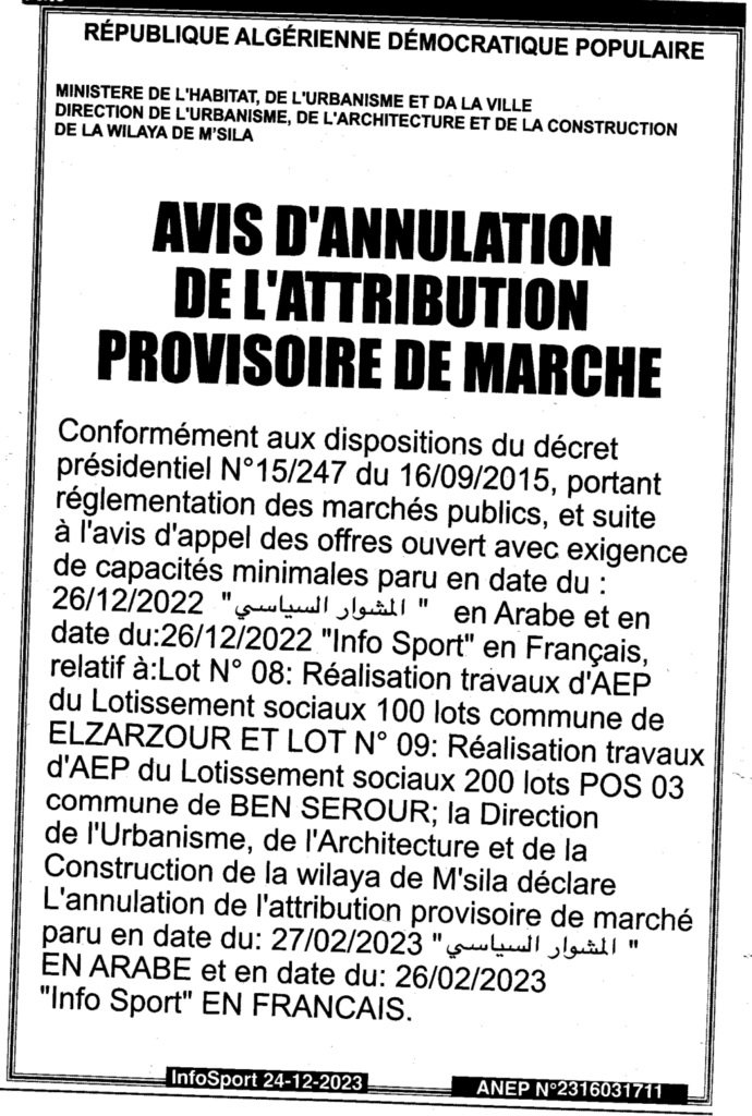 Avis d’annulation de l’attribution provisoire de marche/ Direction de l’urbanisme de l’architecture et de la construction de la wilaya de M’sila