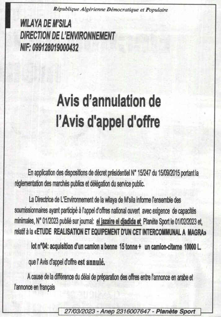 Avis d’Annulation de l’Avis d’Appel d’Offre/ Direction de l’Environnement