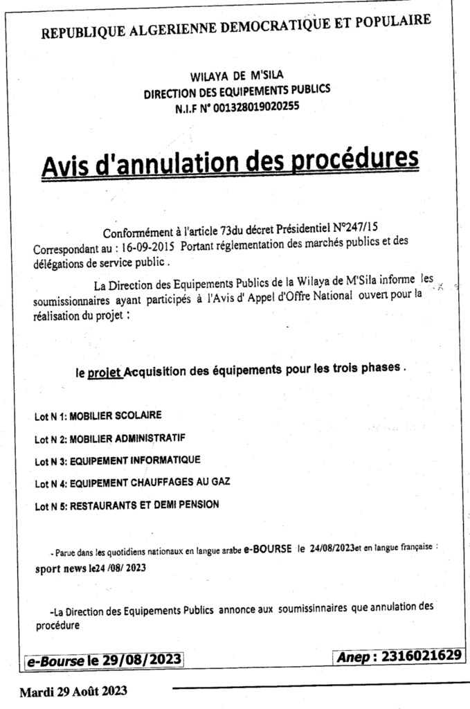 Avis d’annulation des procédures/ direction des équipements publics wilaya de M’sila