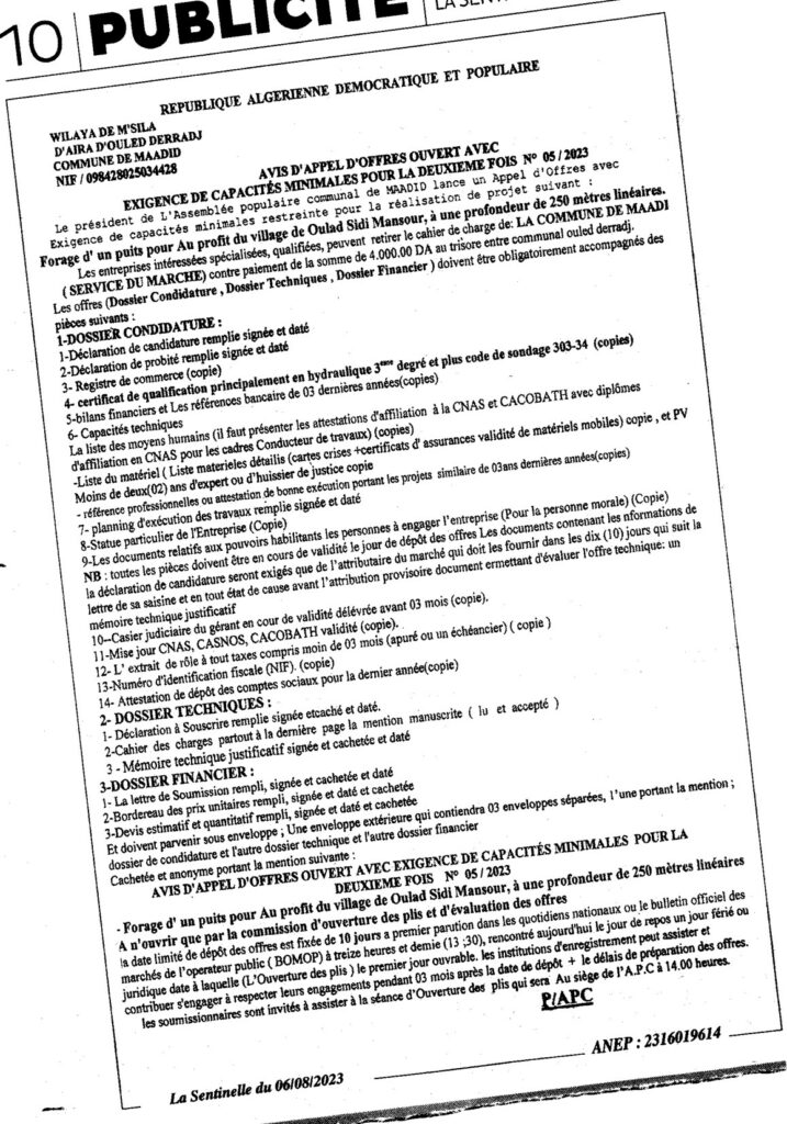 Avis d’appel d’àffres ouvert N°05/2023 Commune de Maadid