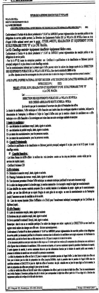 Avis d’appel d’offre national deuxième après infructueux/ Direction des équipements publics