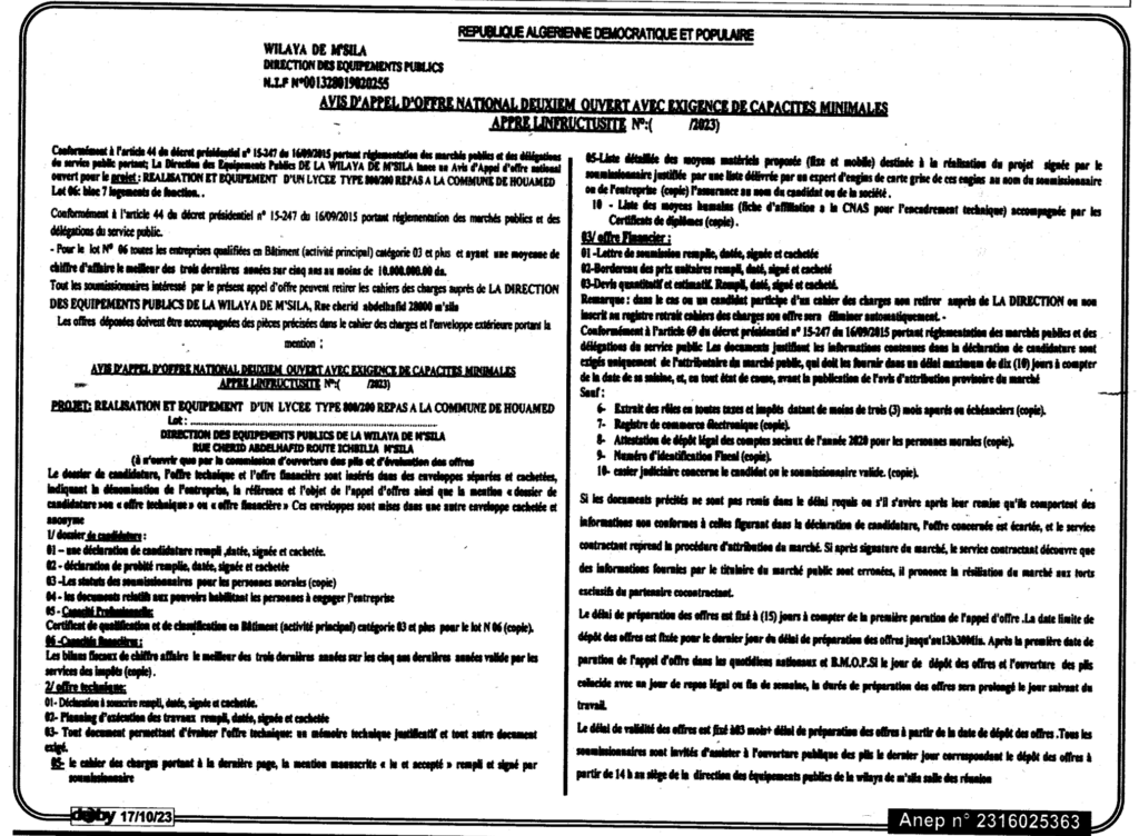 Avis d’appel d’offre national deuxième ouvert/ Direction des Équipements publics