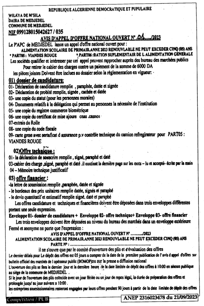 Avis d’appel d’offre national ouvert N°01/2023 Commune de medjedel