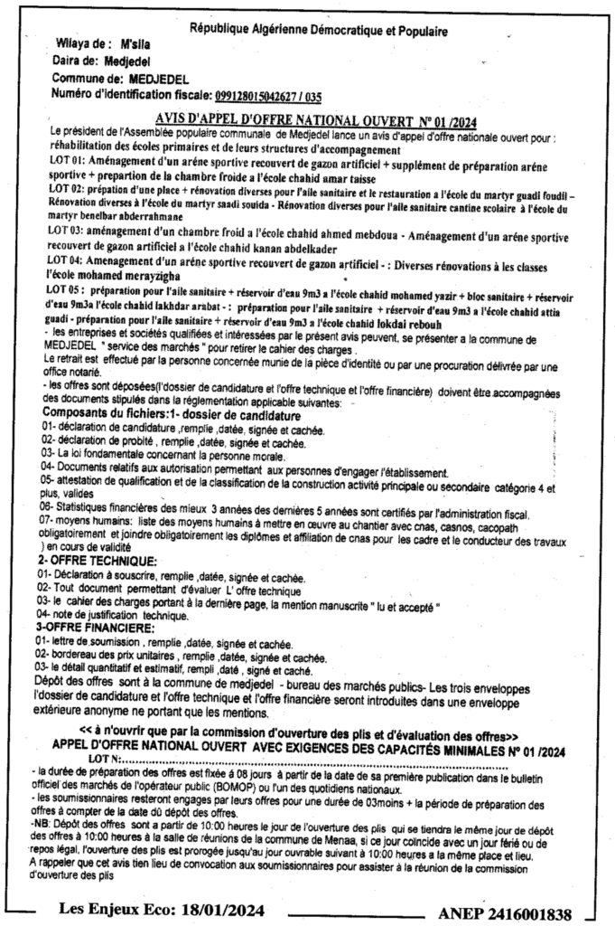 Avis d’appel d’offre national ouvert N°01/2024 Commune de Medjedel