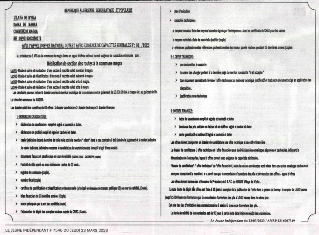 Avis d’Appel d’Offre National Ouvert N°02/2023 Commune de Magra