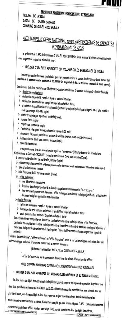 Avis d’appel d’offre national ouvert N°03/2023 Commune de ouled addi gubala