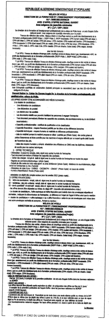 Avis d’appel d’offre national ouvert N°10/2023 Direction de la formation et l’enseignement professionnels