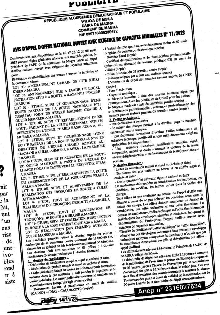 Avis d’appel d’offre national ouvert N°11/2023 Commune de Magra