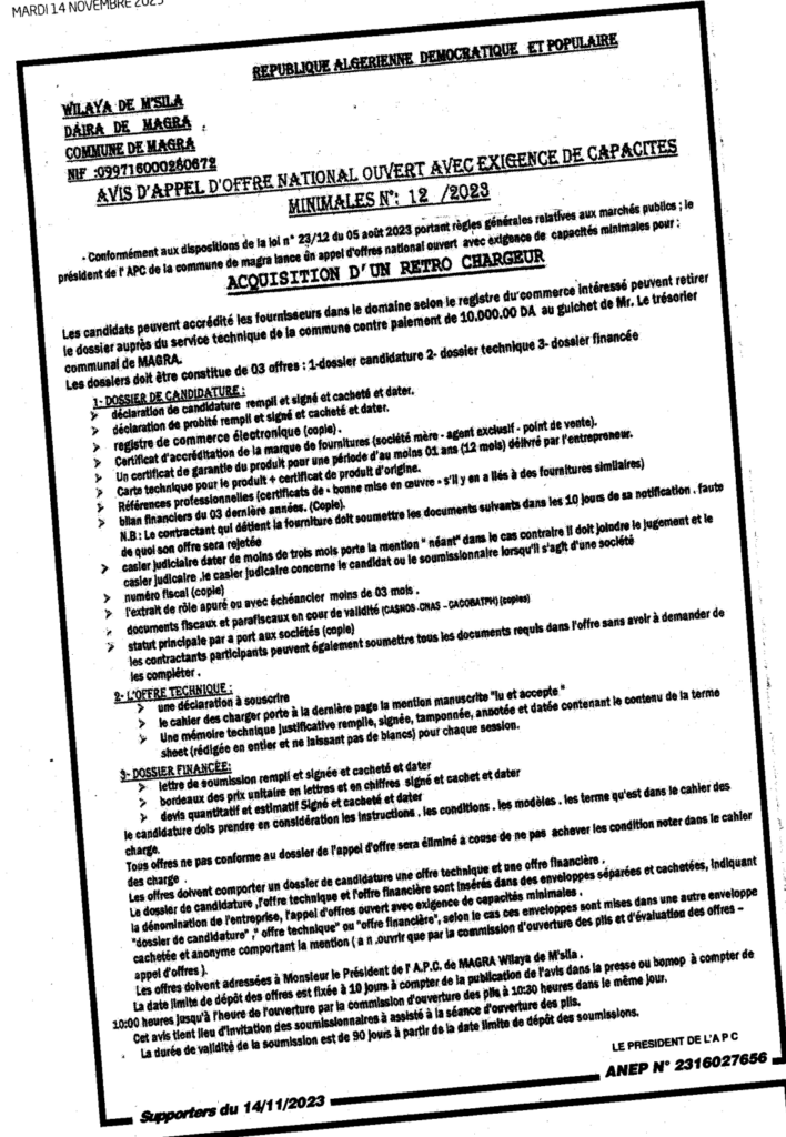 Avis d’appel d’offre national ouvert N°12/2023 Commune de Magra