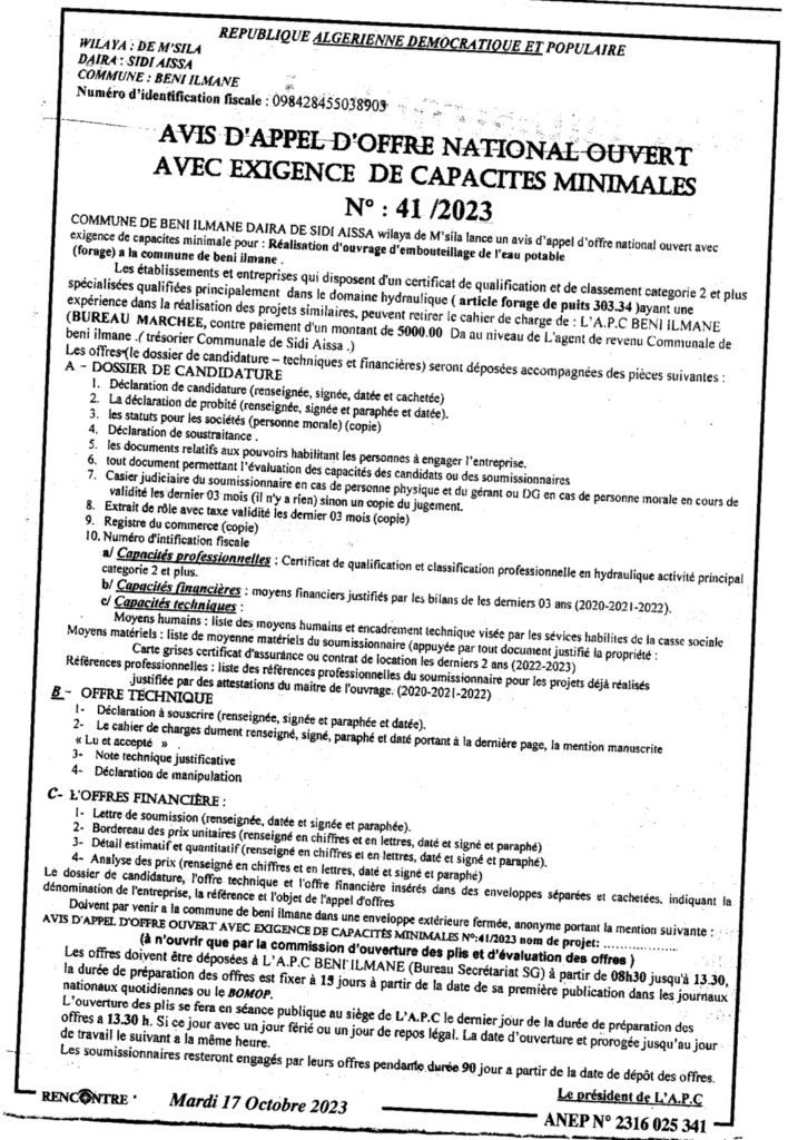 Avis d’appel d’offre national ouvert N°41/2023 Commune Beni Ilmane