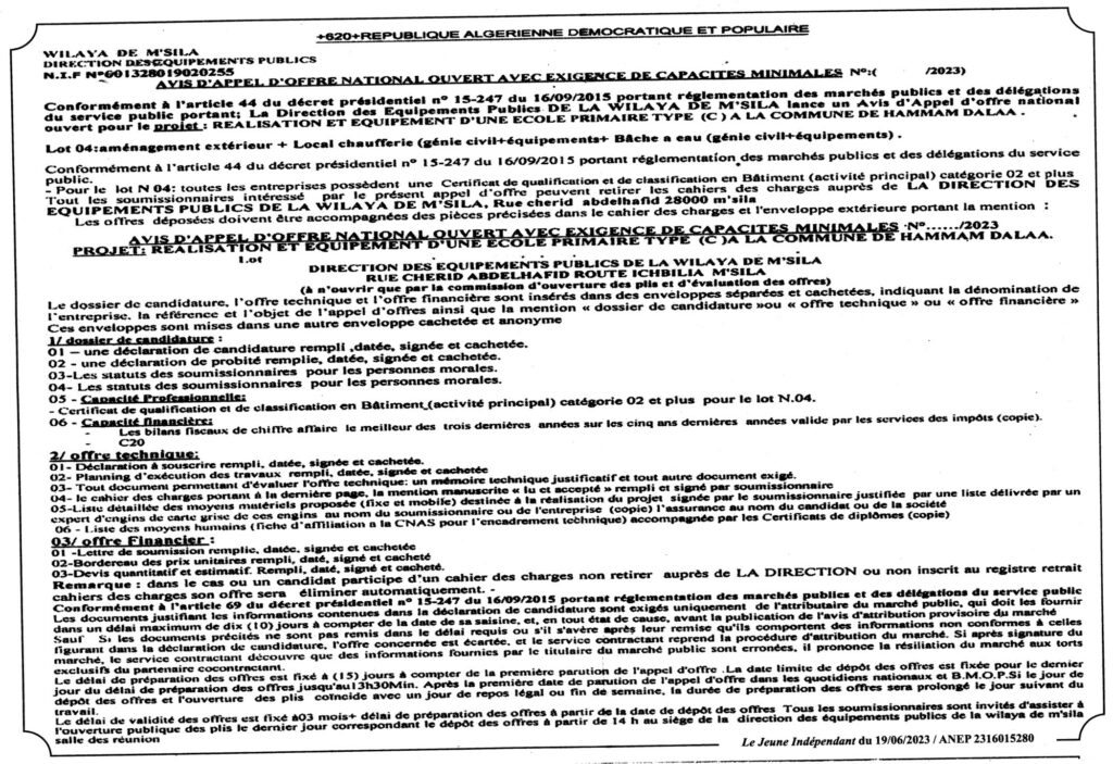 Avis d’appel d’offre national ouvert: Réalisation et équipement d’une école primaire type (c) à la commune de Hammam Dalaa/ Direction des équipements publics