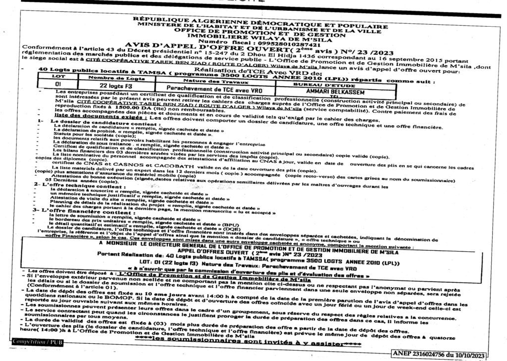 Avis d’appel d’offre ouvert (2éme avis) N°23/2023 O.P.G.I