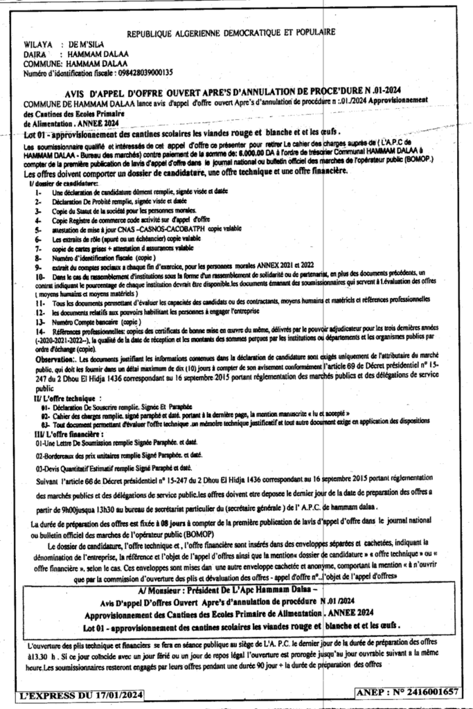 Avis d’appel d’offre ouvert après d’annulation de procédure N°01/2024 Commune de Hammam Dalaa