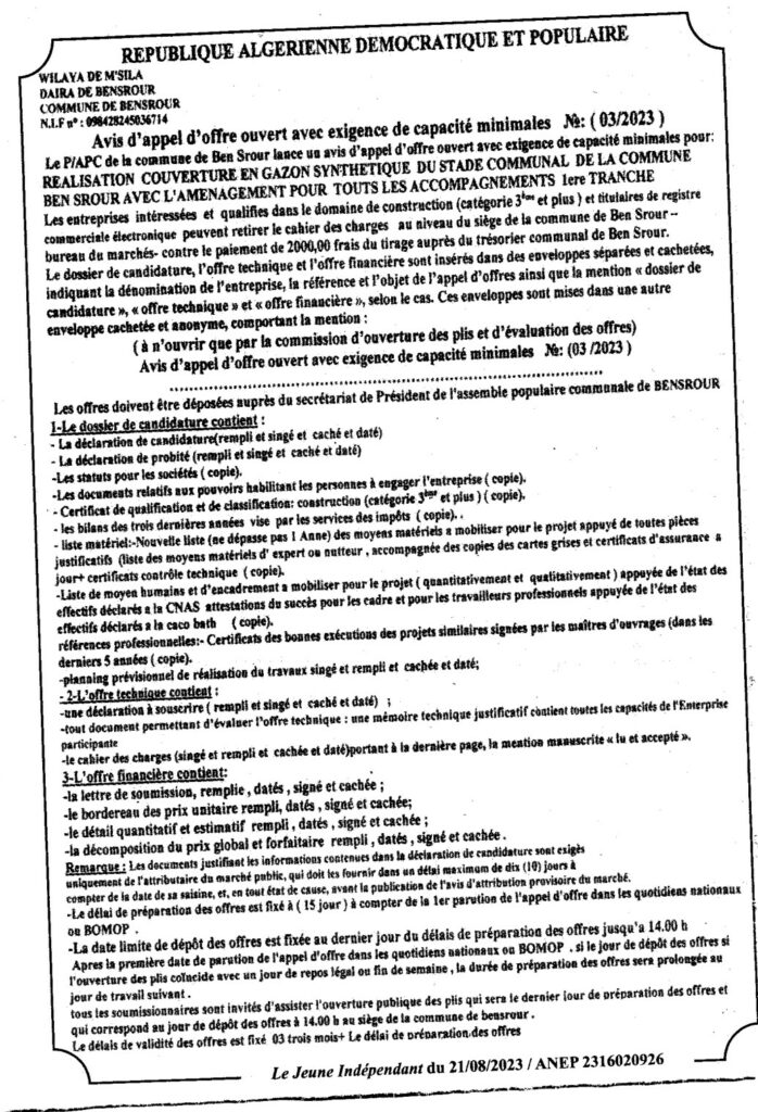 Avis d’appel d’offre ouvert N°03/2023 Commune de Bensrour