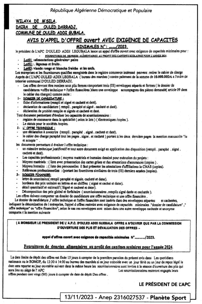 Avis d’appel d’offre ouvert N°04/2023 Commune d’Ouled Addi Guebala