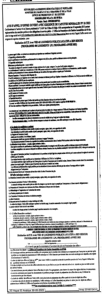 Avis d’appel d’offre ouvert N°10/2023 Office de Promotion et de Gestion Immobilier wilaya de M’sila