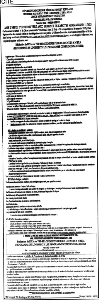 Avis d’appel d’offre ouvert N°11/2023 Office de Promotion et de Gestion Immobilier wilaya de M’sila